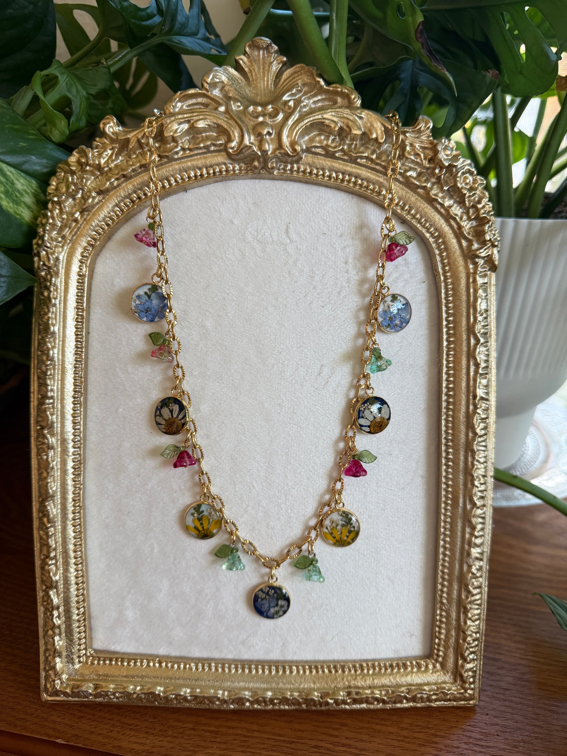 Gold charm necklace (pearlescent & sapphire)