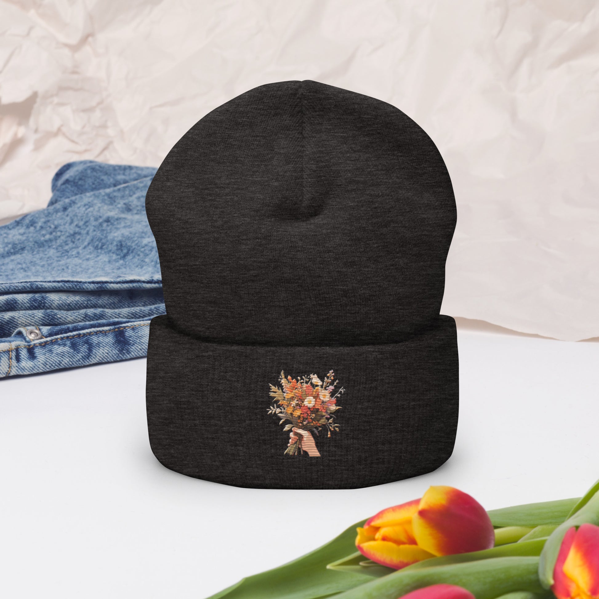 Hand Flower Bundle Embroidered Cuffed Beanie