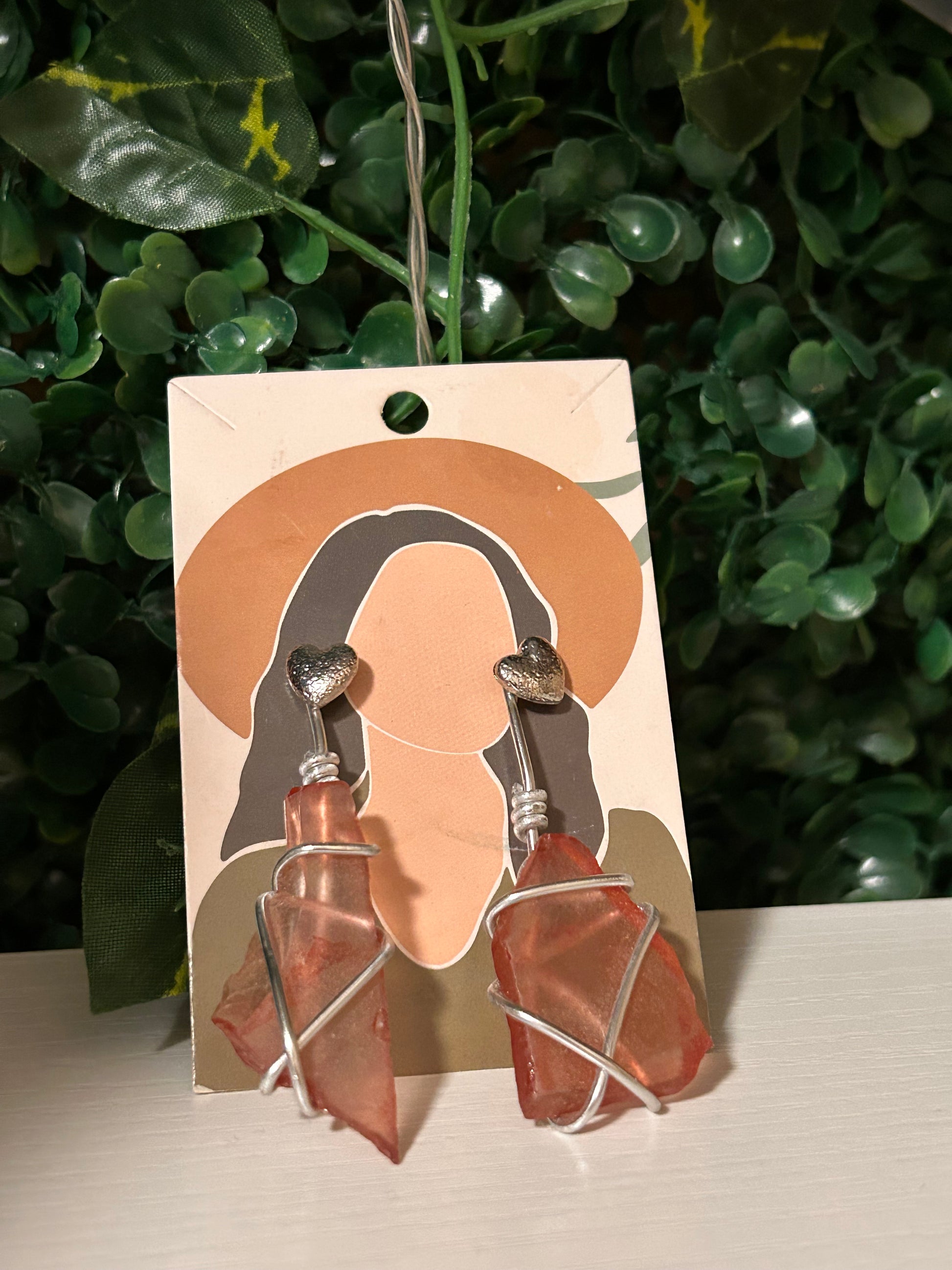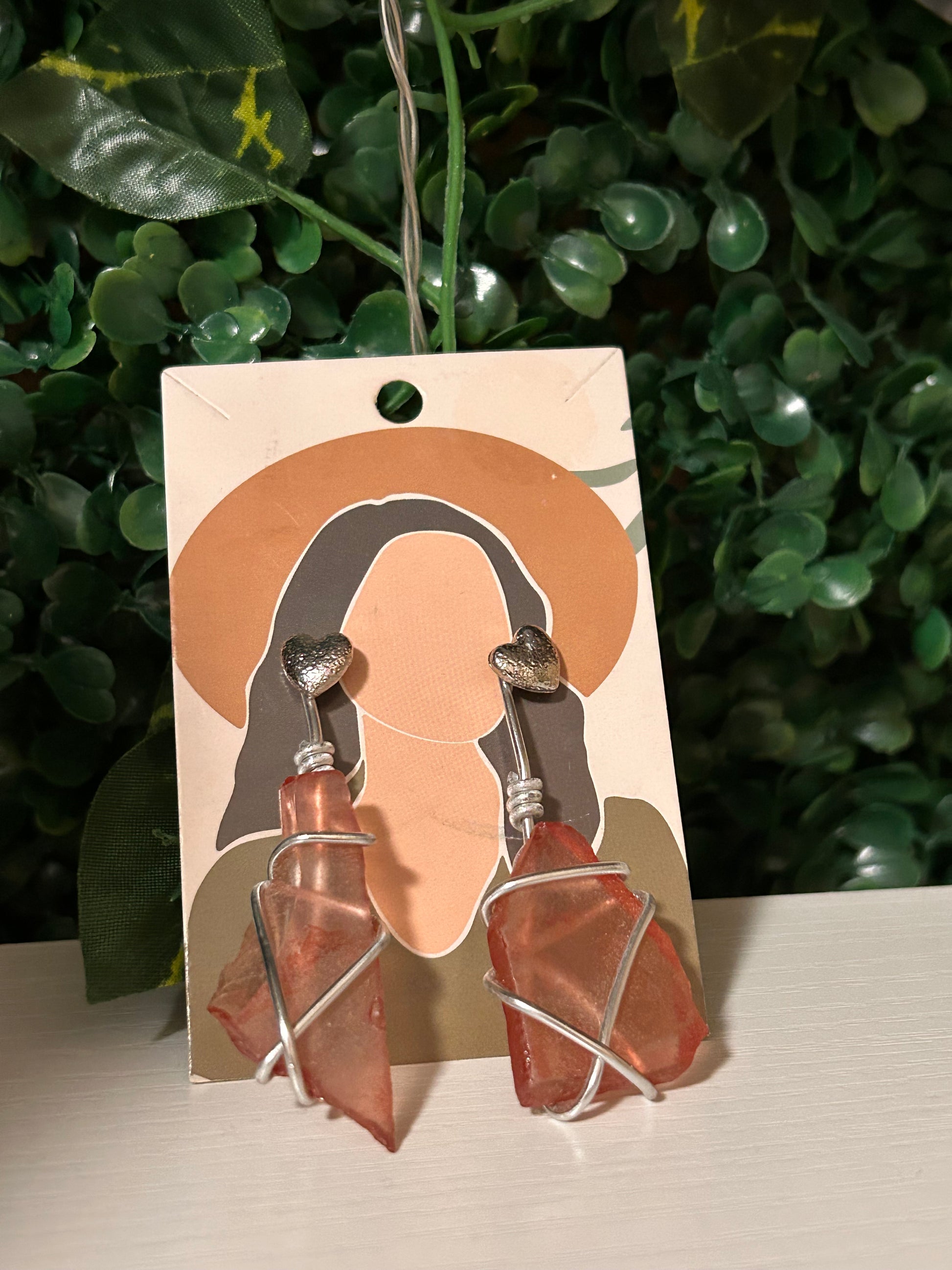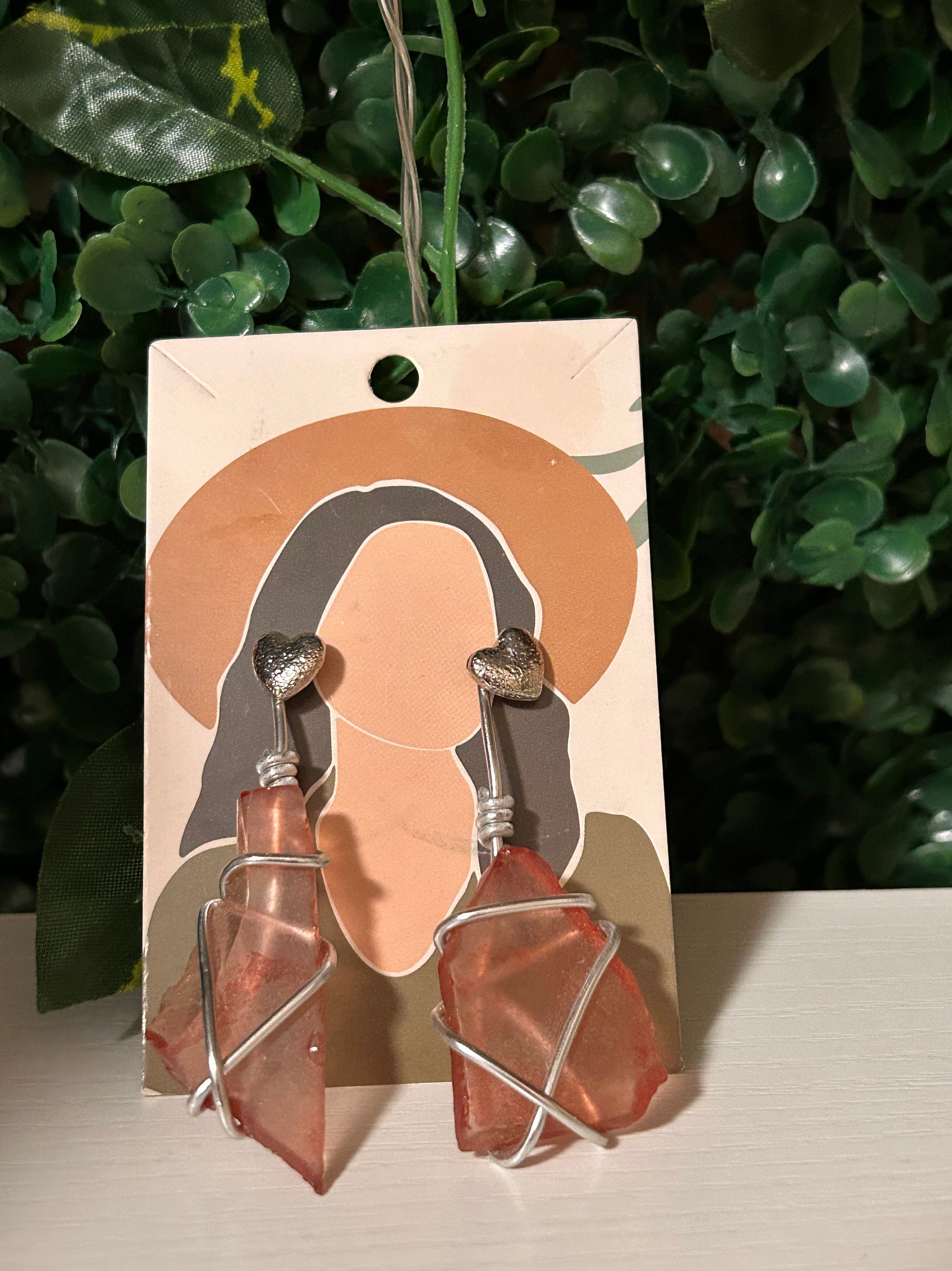 Red seaglass silver wire wrapped earrings