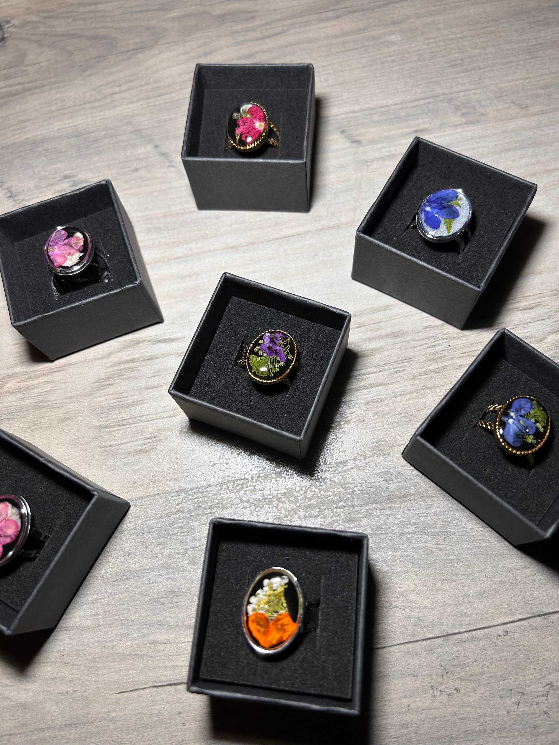 These are our ring blind bags! They are all made with real flowers and come with 1 ring. They are all 1 of a kind. They make a great gift for the holidays or a fun jewelry reveal to do yourself!